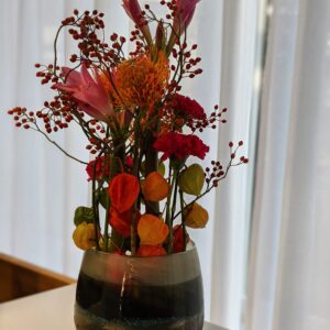 Blumengesteck mit Blumen der Saison, Gesteck im hochwertigem Glas oder Keramikgefäß, Farben nach Wahl.